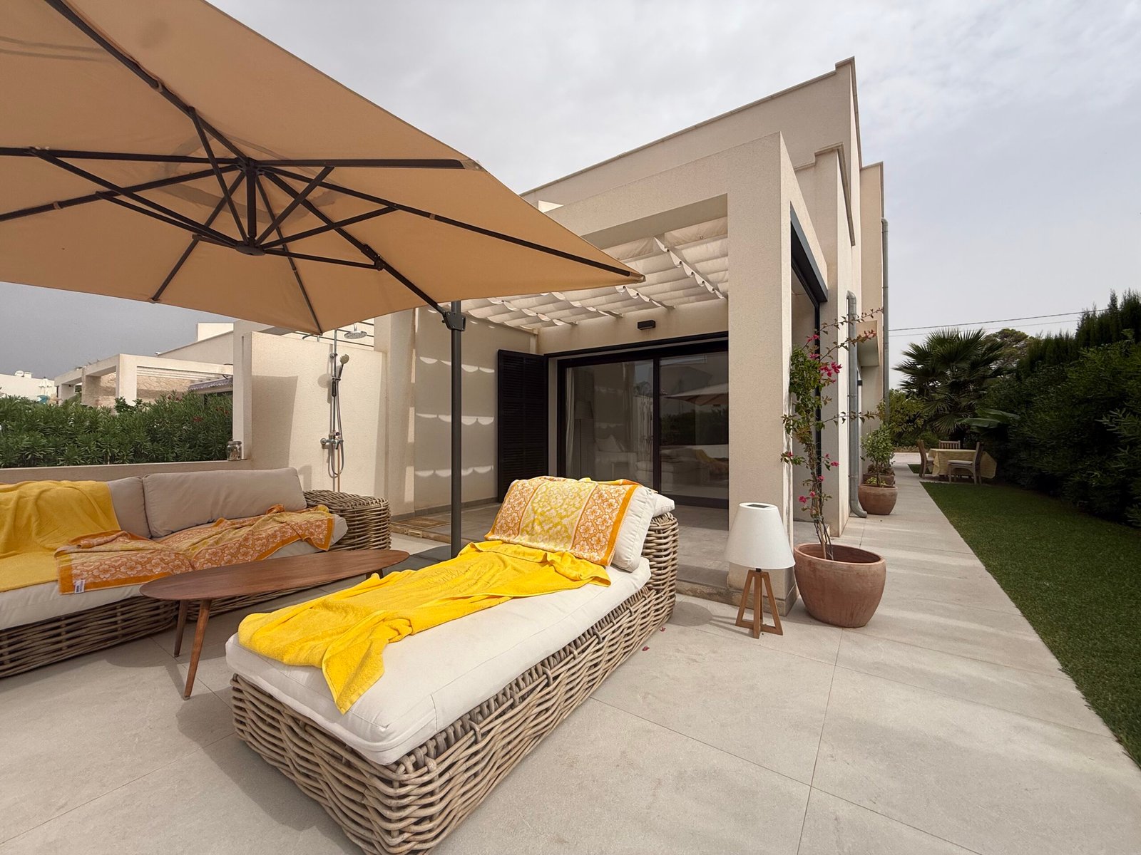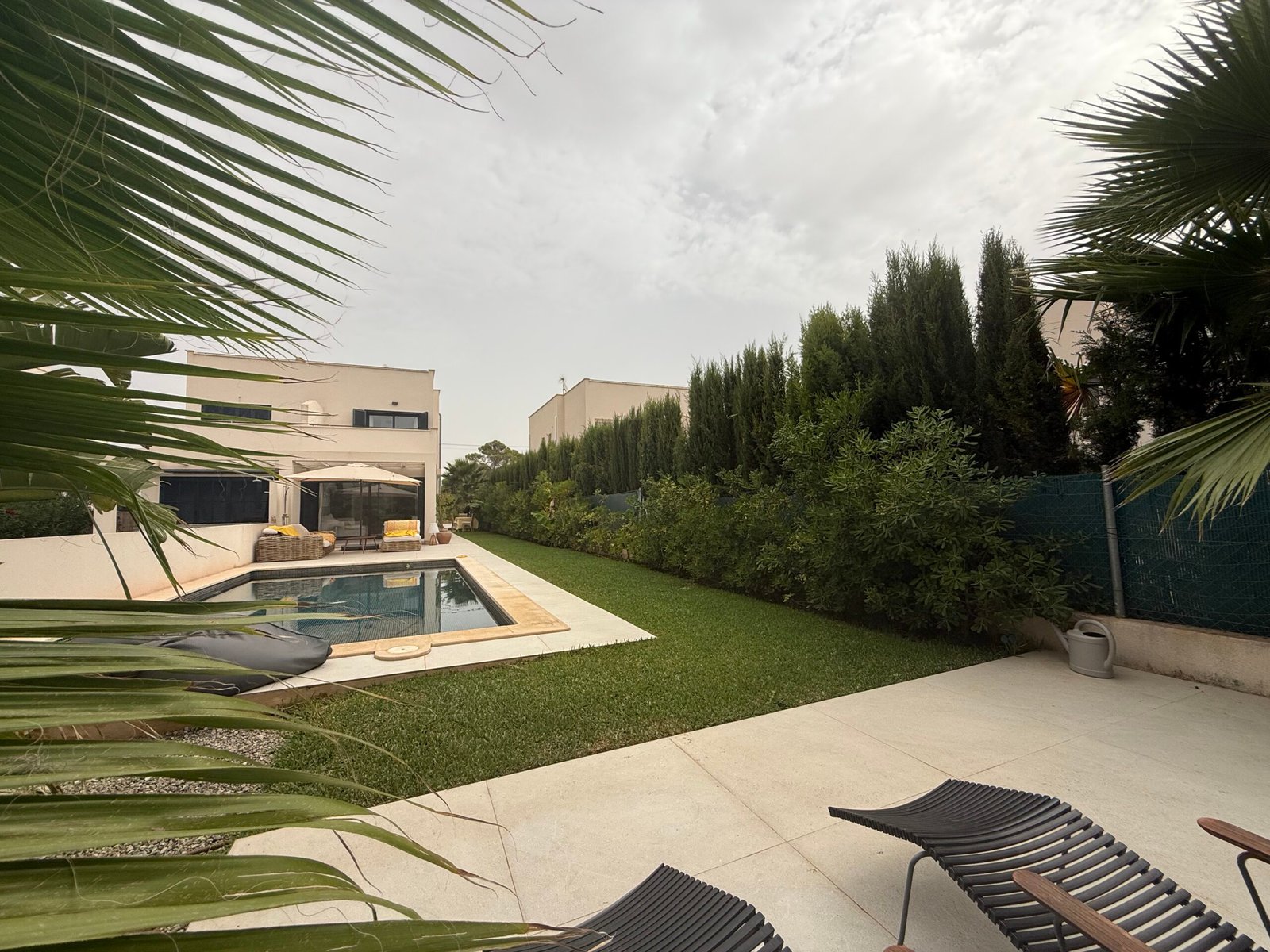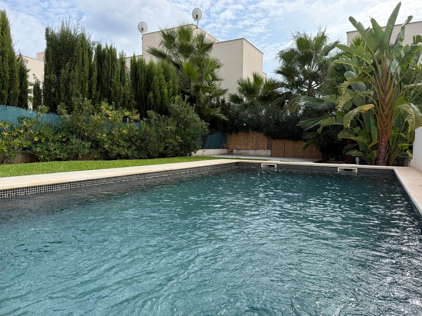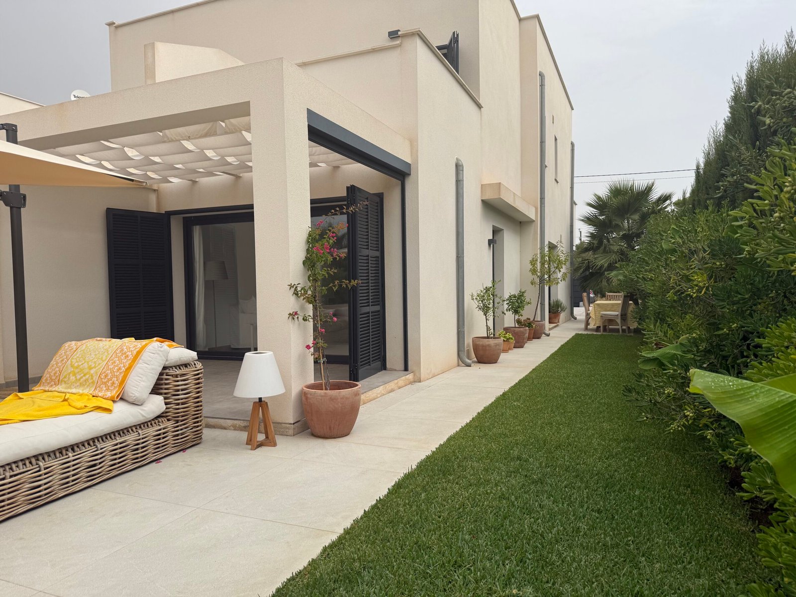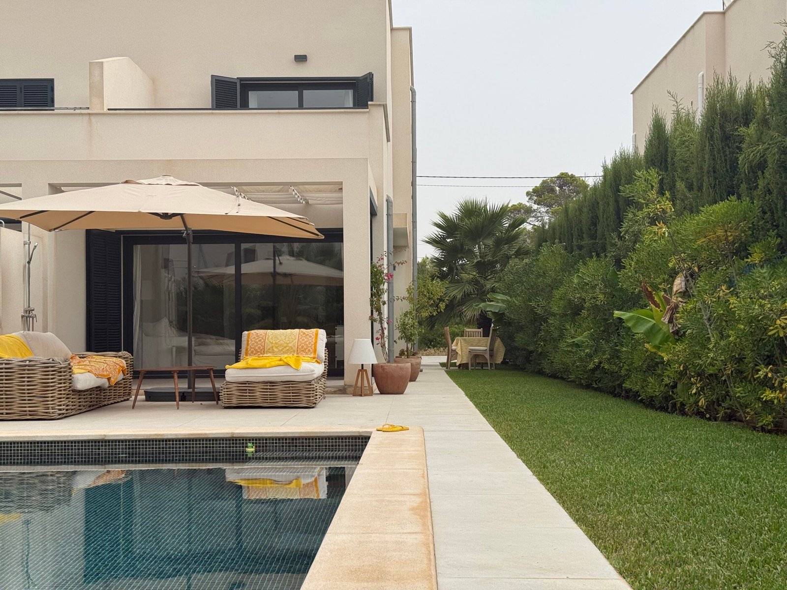 In einer ruhigen Sackgassenlage befindet sich diese Doppelhaushälfte mit einer Wohnfläche von ca. 125 m², verteilt auf zwei Etagen und ausgestattet mit allem, was zeitgemäßes Wohnen auf Mallorca ausmacht. Bereits beim Betreten des Hauses empfängt Sie ein lichtdurchfluteter Eingangsbereich, der nahtlos in den großzügigen Wohnbereich übergeht. Die moderne, offene Raumgestaltung verbindet ein gemütliches Wohnzimmer, den stilvollen Essbereich, sowie eine voll ausgestattete, offene Küche. Ein grosses Gäste WC und ein Abstellraum befinden sich ebenfalls im Erdgeschoss. Über die “Frühstücks-Terasse” vor der Küche oder über die grosse Sonnenterrasse vor dem Wohnzimmer gelangt man aus dem Wohnbereich direkt in den liebevoll angelegten, mediterranen Garten mit Palmen und Bananenbäumen. Highlight des ca. 350m2 grossen Gartens ist der grosse (ca. 32 m²), herrliche Salzwasserpool. Eine Innentreppe verbindet das Erdgeschoss mit dem Obergeschoss, das zwei komfortable Doppelschlafzimmer beherbergt – jeweils mit eigenem Bad en Suite, Einbauschränken und Sonnenterassen. Ein weiteres Highlight erwartet Sie eine Etage höher: Die großzügige Dachterrasse, von der aus Sie einen spektakulären Panoramablick auf das Meer und die Berge genießen – der perfekte Ort für entspannte Abende und Sonnenuntergänge.