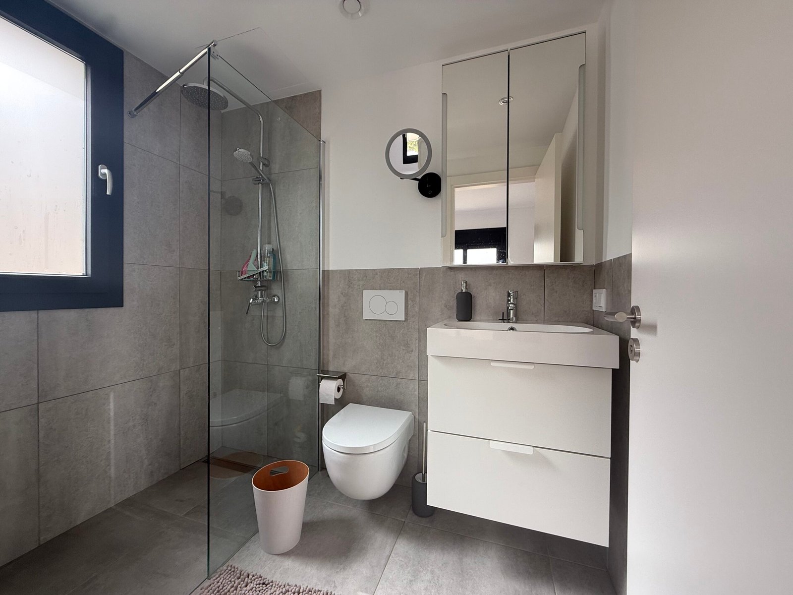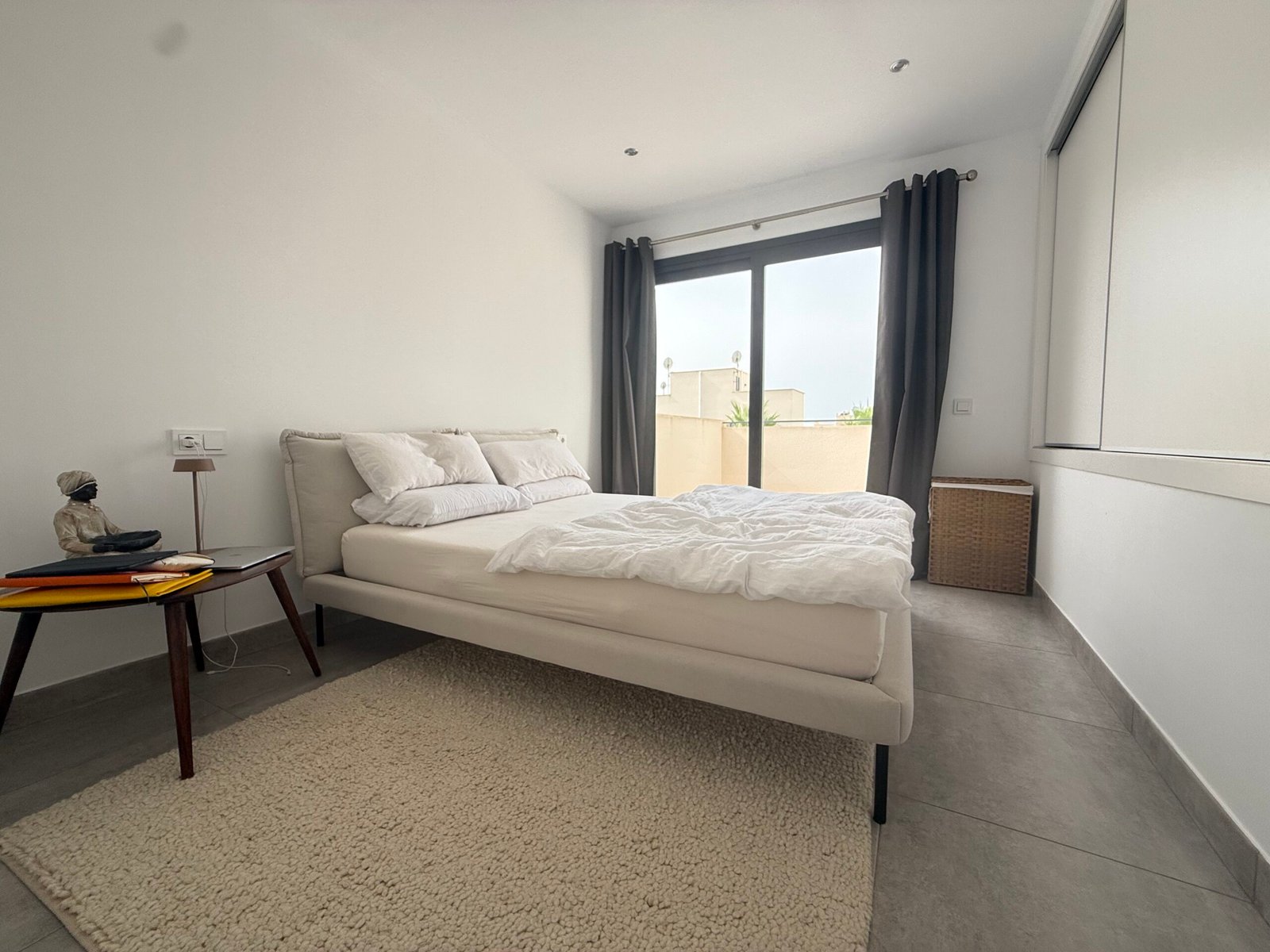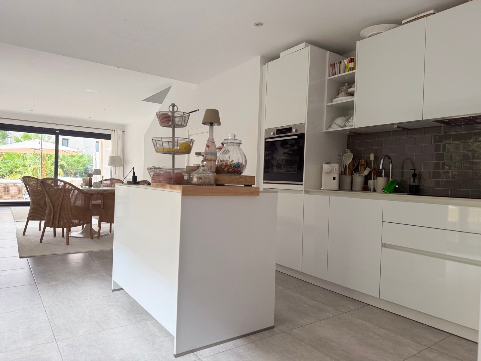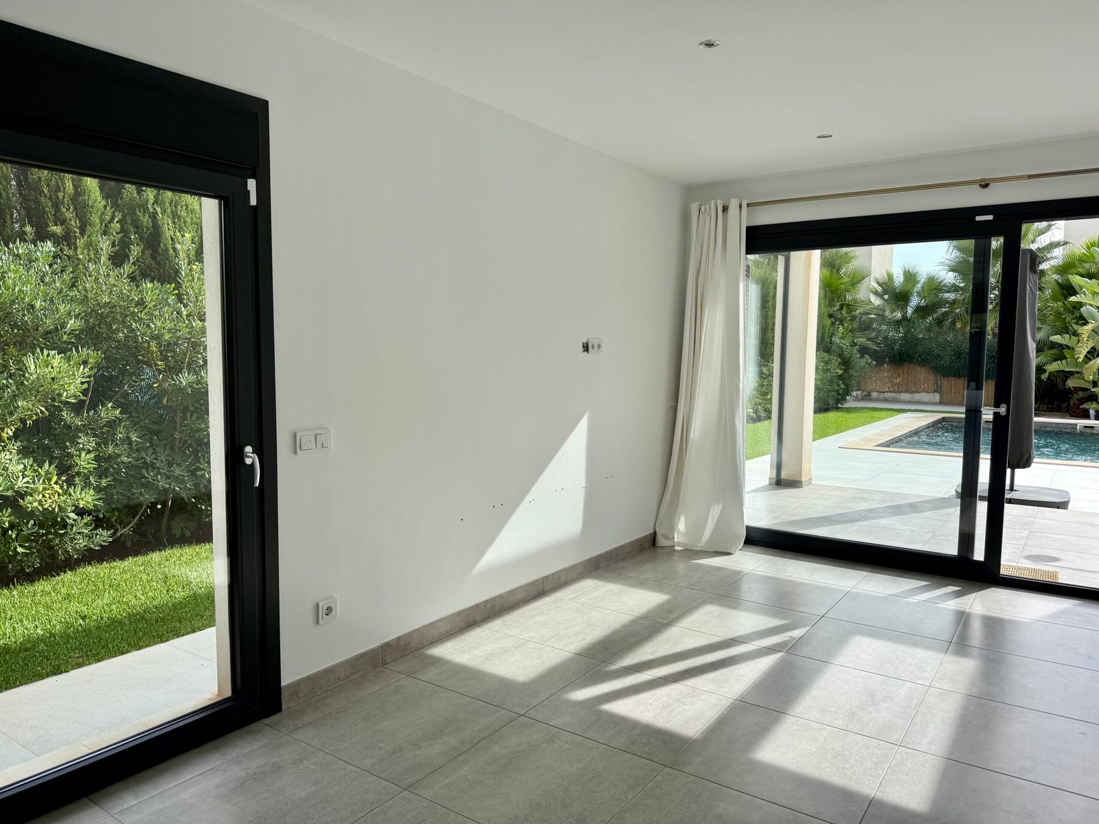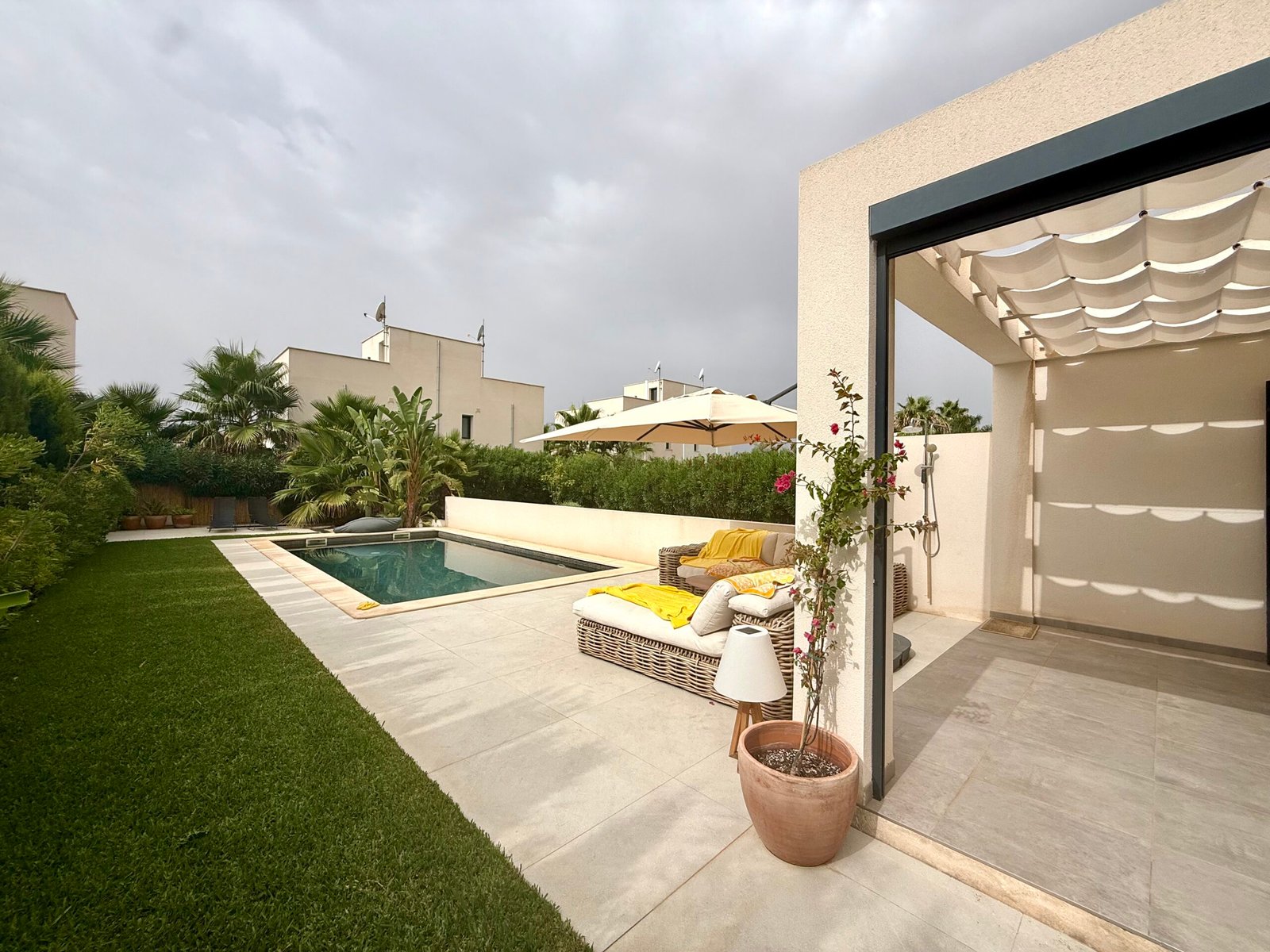 In einer ruhigen Sackgassenlage befindet sich diese Doppelhaushälfte mit einer Wohnfläche von ca. 125 m², verteilt auf zwei Etagen und ausgestattet mit allem, was zeitgemäßes Wohnen auf Mallorca ausmacht. Bereits beim Betreten des Hauses empfängt Sie ein lichtdurchfluteter Eingangsbereich, der nahtlos in den großzügigen Wohnbereich übergeht. Die moderne, offene Raumgestaltung verbindet ein gemütliches Wohnzimmer, den stilvollen Essbereich, sowie eine voll ausgestattete, offene Küche. Ein grosses Gäste WC und ein Abstellraum befinden sich ebenfalls im Erdgeschoss. Über die “Frühstücks-Terasse” vor der Küche oder über die grosse Sonnenterrasse vor dem Wohnzimmer gelangt man aus dem Wohnbereich direkt in den liebevoll angelegten, mediterranen Garten mit Palmen und Bananenbäumen. Highlight des ca. 350m2 grossen Gartens ist der grosse (ca. 32 m²), herrliche Salzwasserpool. Eine Innentreppe verbindet das Erdgeschoss mit dem Obergeschoss, das zwei komfortable Doppelschlafzimmer beherbergt – jeweils mit eigenem Bad en Suite, Einbauschränken und Sonnenterassen. Ein weiteres Highlight erwartet Sie eine Etage höher: Die großzügige Dachterrasse, von der aus Sie einen spektakulären Panoramablick auf das Meer und die Berge genießen – der perfekte Ort für entspannte Abende und Sonnenuntergänge.